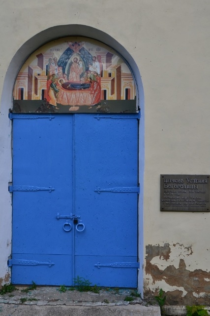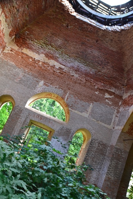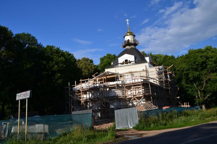 Кстати говоря, перед входом на территорию установлен памятник Вадиму Сергеевичу Усову, который был директором Тульского машиностроительного завода. В 1983 году земли бывшего имения Толстых были переданы на баланс предприятия для обустройства подсобного хозяйства, и с этого момента основательно заброшенное бывшее имение получило шанс к возрождению. Были воссозданы главный усадебный дом и купальня, частично восстановлен храм Успения Богородицы. Судя по табличке перед входом, реставрация церкви должна была завершиться в 1991 году – но увы: