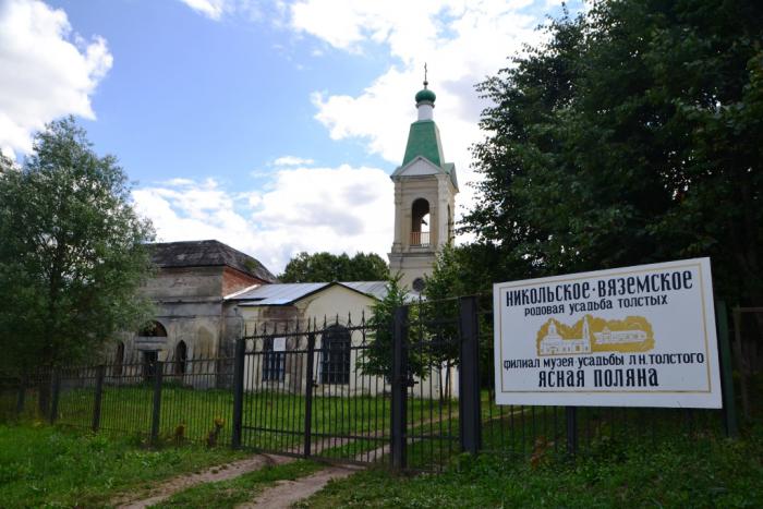 «Никольское-Вяземское – родовое имение семьи Толстых, принадлежавшее предкам писателя по отцовской линии. Расположено к югу от Ясной Поляны, в Чернском районе, на границе с Орловской областью, на берегу реки Чернь. По народной легенде, в реке была найдена икона Николая Чудотворца, и село стали называть Никольским. Со временем к этому названию стали добавлять слово Вяземское, поскольку первым владельцем села являлся князь Фёдор Вяземский. С 1747 года Никольское стало принадлежать прадеду Л. Н. Толстого — князю Николаю Ивановичу Горчакову, секунд-майору в отставке. Когда его старшая дочь Пелагея вышла замуж за графа Илью Андреевича Толстого, в приданое родители подарили молодым имение Никольское – Вяземское.