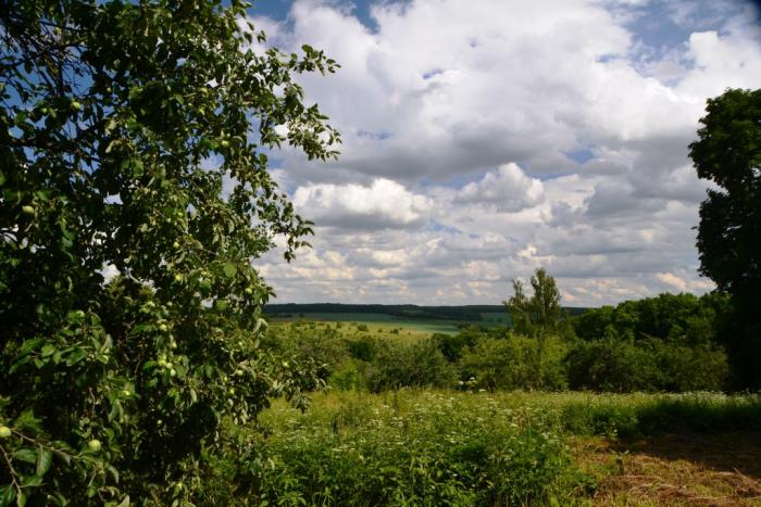 Между аллеями – порядком заросший яблоневый сад, вдали – убегающие за горизонт поля и перелески: