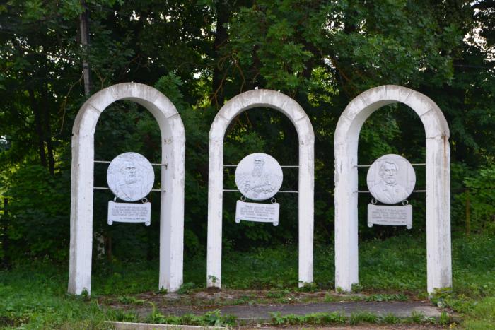 На асфальтированной площадке перед окруженной оградой парком – приличествующие случаю барельефы, судя по всему, еще советской выделки: портреты Фета, Толстого и Тургенева.