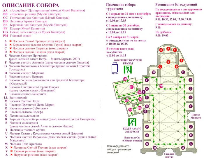 Вход туристов осуществляется со стороны третьих, северных ворот – портал Альмойна. Внутрь собора попадаешь через музей, так что приготовьтесь заплатить за входной билет символическую сумму (по-моему, около 6 евро). Кстати, музей действительно стоит посмотреть. Поможет разобраться в самом интересном бесплатный путеводитель и проспект на русском языке (не забыть взять на информационной стойке перед входом в музей). Предложенная схема позволит оптимально выстроить знакомство с собором и поможет не пропустить самое интересное из доступного для осмотра (так как самая древняя часть храма закрыта для туристов, увидеть гробницу короля Жауме II не получится).