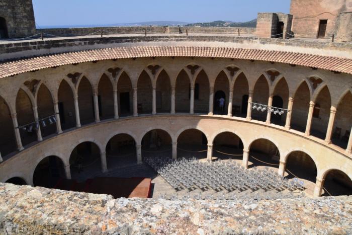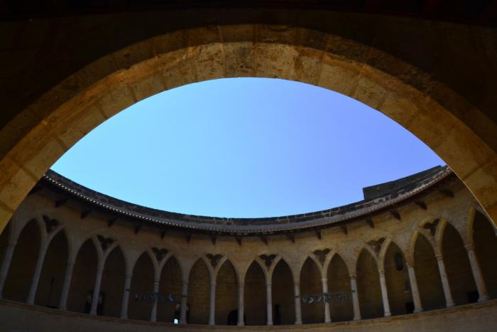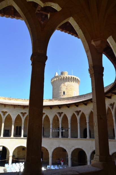 Замок Бельвер: построен в 1300-1311 годах по приказу короля Майорки Жуаме II. Замок расположен на холме высотой в 112 метров и находится приблизительно в трех километрах от центра Пальмы. Это одно из самых оригинальных сооружений на Майорке и уж точно – самый необычный замок из всех, что мне довелось видеть. Если посмотреть на схему, то ясно видна его круговая организация. В центре – круговой центральный патио, вокруг – четыре башни, ориентированные по четырем частям света. Три из них встроены в корпус здания, четвертая – башня майор (или башня почтения) – соединена с основным корпусом небольшим переходом.