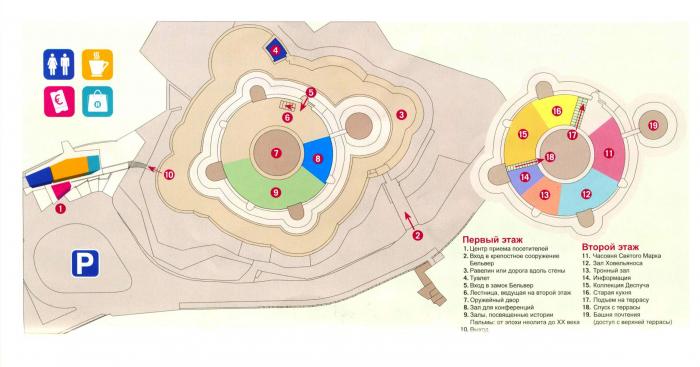 Входной билет в замок обойдется в символические 4 евро. Узнав язык, на котором вы предпочитаете общаться, в кассе выдадут соответствующий проспект: