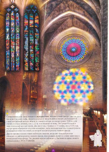 А вот и еще одно уникальное явление, которое можно наблюдать дважды в год, 2 февраля и 11 ноября, около 8.30 утра. В это время на стене внутри храма образуется световая «восьмерка», когда «многоцветная тень от большой розетки размещается точно под стеной, на которой находится розетка главного фасада». Мы были в соборе 9 июля, так что полюбоваться на это световое великолепие могли только на страницах путеводителя: