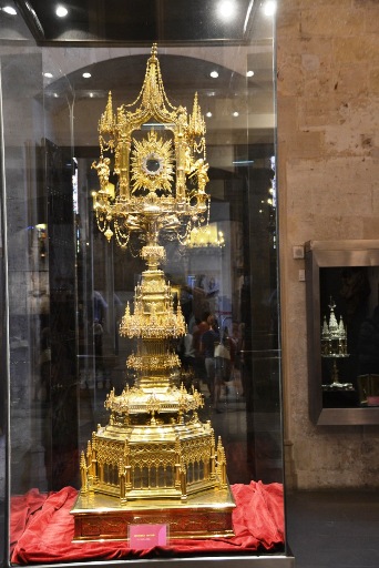 Первое – красная ризница, где выставлены многочисленные реликвии и драгоценная церковная утварь. Например, такая, как эта дарохранительница из позолоченного серебра: