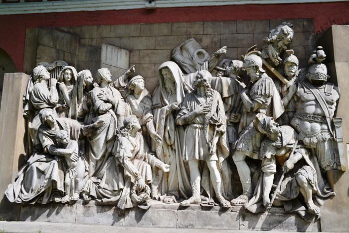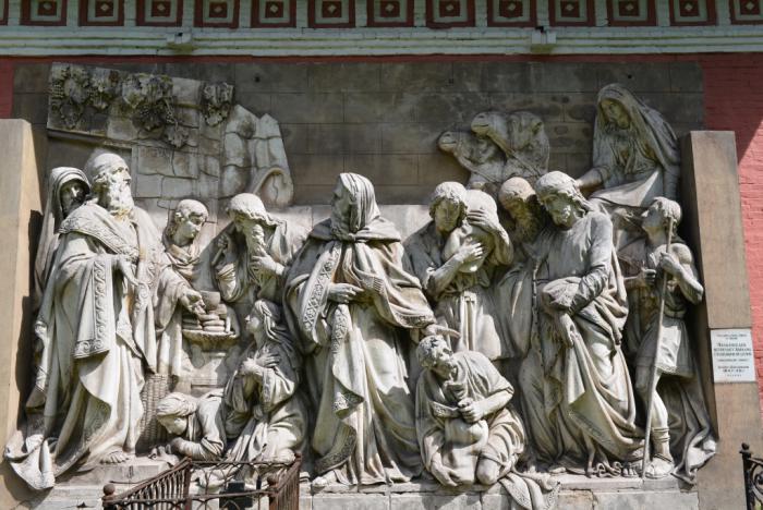 Мраморные горельефы с оригинального Храма Христа Спасителя были свезены сюда перед тем, как его разрушили в тридцатые годы. После восстановления их место на стенах главного храма заняло бронзовое литье, а мраморные оригиналы остались на стенах Донского монастыря.