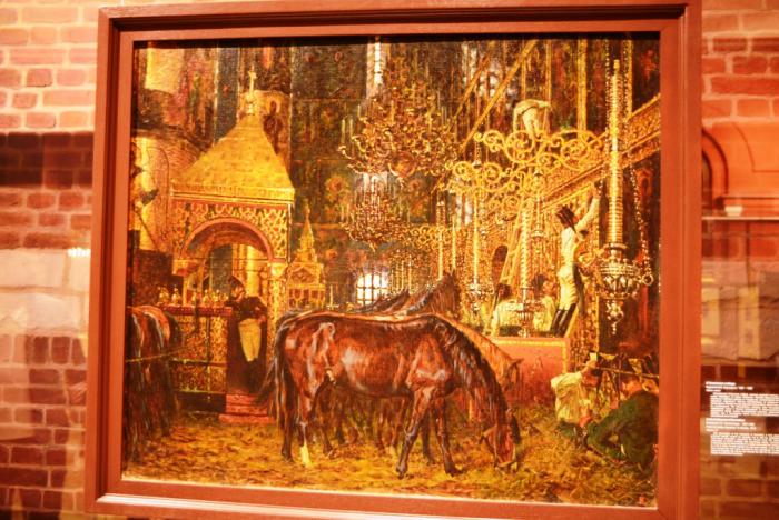— цикл полотен Василия Васильевича Верещагина «1812 год», среди которых – картина «В Успенском соборе»: в священном для русского человека месте неприятельские войска устроили конюшню