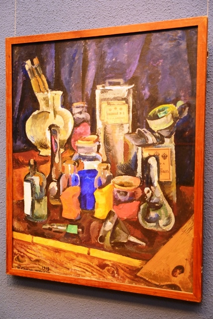 Вот что интересно: работы Гончаровой выставлены в одном зале с картинами ее мужа, Михаила Ларионова. Наблюдать за перекличкой двух родственных душ в картинах – одно удовольствие. Вот автопортрет Гончаровой – и парный к нему автопортрет Ларионова: