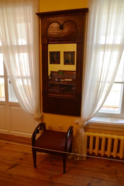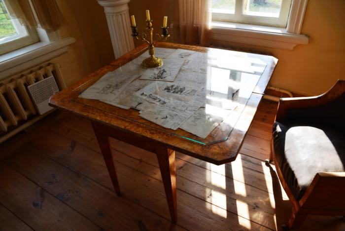 Экскурсовод обратила наше внимание на расположение рабочего уголка Пушкина: не возле окна, откуда падал солнечный свет, а около стены. Дело в том, что осень была очень холодной, из окна веяло холодом (не будем забывать – дом-то был нежилым), и комфортно себя можно было чувствовать только в тепле, идущем от нагретой стены – в этом месте она нагревалась от натопленной печи.