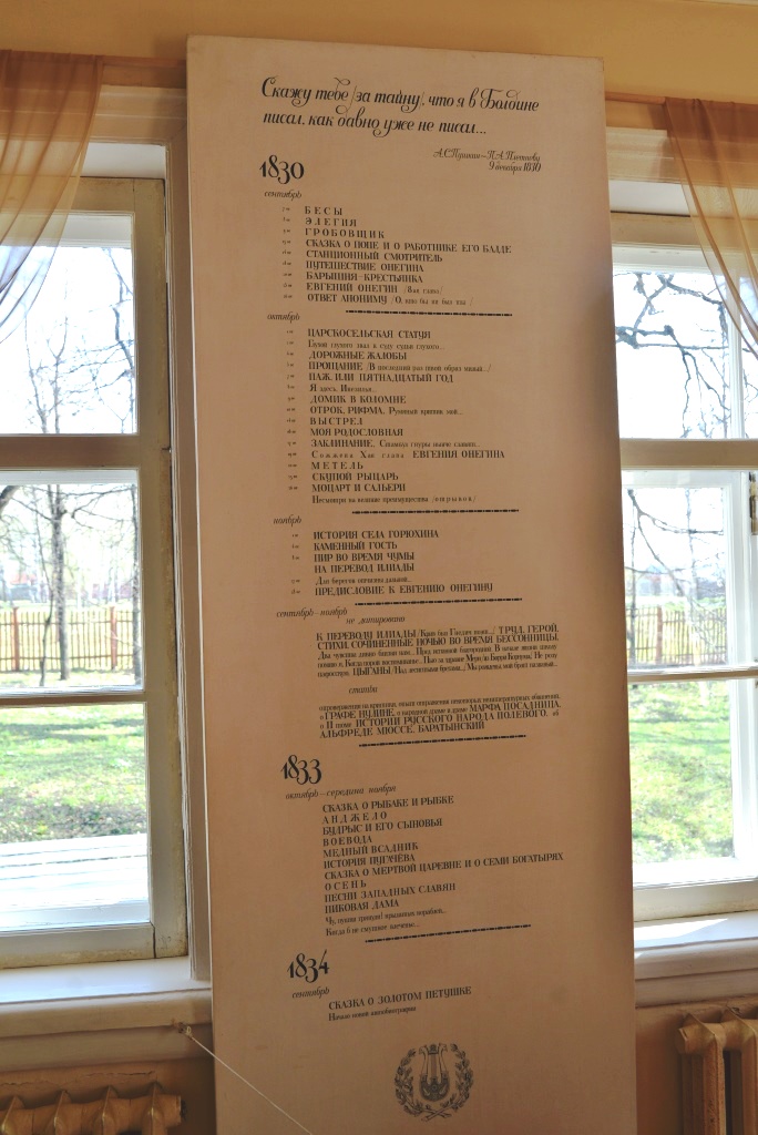 Для наглядности в экспозиции музея представлен стенд с перечислением всех написанных в Болдине произведений:
