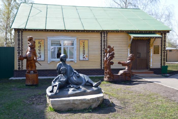 Это, если не догадались, маленький Пушкин со своей знаменитой няней Ариной Родионовной. Памятник установлен по инициативе писателя-сатирика Михаила Задорнова. Причем обратите внимание: герои изображены с яблоками – так вот этот памятник изначально стоял на территории усадебного парка, вернее, в яблоневой саду – там эта композиция была бы более логичной. Но в силу каких-то причин памятник перенесли – и на фоне деревянных скульптур он стал каким-то карикатурным, что ли. Хотя если представить его не в этом окружении, а в тени яблоневых деревьев – то идея кажется очень милой: мы-то Арину Родионовну представляем уже «Выпьем, няня, где же кружка!» — а ведь маленького Сашу она воспитывала, когда была молодой и сильной женщиной, крестьянкой (и даже кормилицей старшей дочери в семействе Пушкиных – Ольги).