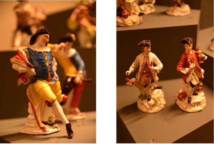 Множество витрин, в которых выставлены объединенные по тематике фигурки: здесь и ремесленники – каждый со своим набором инструментов, и крестьяне с корзинками плодов и овощей, и члены почтенных бюргерских семейств, и солдаты разных родов войск, и даже персонажи венецианской комедии дель арте — Коломбина, Скарамучча, Арлекин, Панталоне, Бригелла, Тарталья и много-много других миниатюрных изящных фигурок!