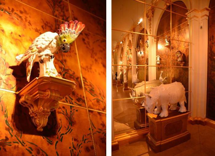 Прихотливый фантазийный мир китайского и японского фарфора сменяется реализмом прославленного мейсенского в «Зале зверей» — на схеме под номером 2.