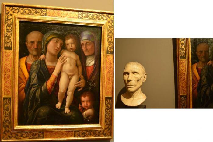 Контраст между нежными детскими лицами и лицом Марии подчеркивается строгим обликом пожилых людей. Лицо старика на картине очень напоминает классический римский портрет, возможно, именно чтобы подчеркнуть это сходство, рядом с картиной установлен бюст.