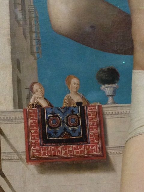 Пока Святой Себастьян на картине страдает согласно утвержденному канону, богатые аристократки скучают от заминки в действии:
