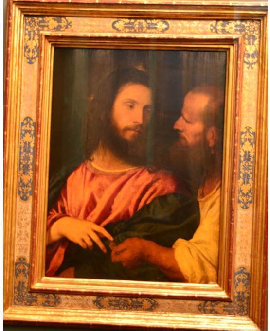В основе сюжета картины – библейская история о том, как фарисеи задали Иисусу провокационный вопрос, чтобы потом донести на него римским властям. Когда один из евреев спросил, стоит ли платить налоги, Иисус показал на отчеканенный на монете портрет кесаря и произнес: «Отдайте кесарево кесарю, а Богу богово».