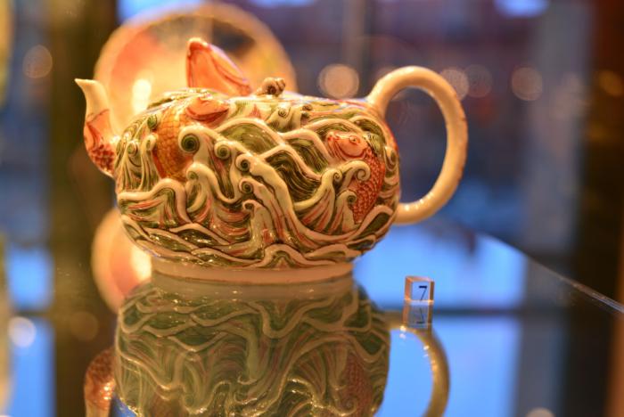 А вот этот чайник с «выпрыгивающими» из фарфоровых волн рыбами меня просто убил наповал. Теперь понятно, откуда Миядзаки черпал вдохновение для бури в своем фильме «Рыбка Поньо на утесе»!