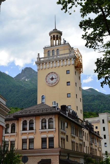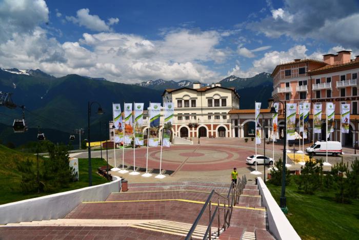 Центр жизни курорта – площадь перед зданием Ратуша Роза Хутор, внешний облик которого призван напомнить об историческом здании железнодорожного вокзала в Большом Сочи.