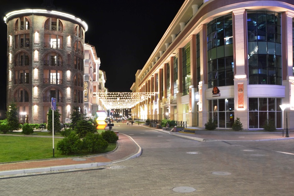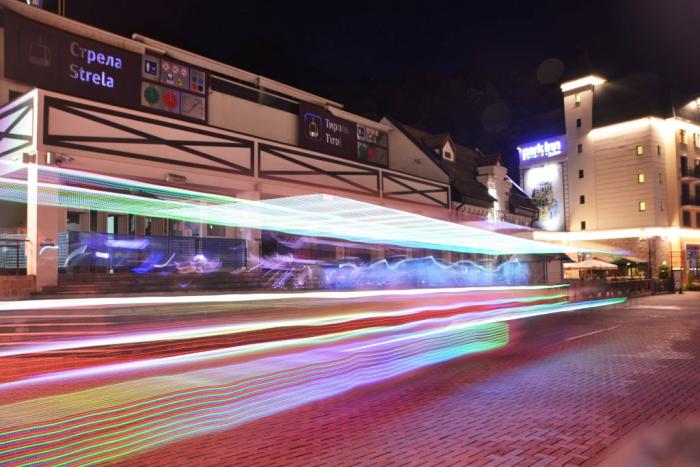 Вечером улицы курорта ярко освещены, своим гостям Роза Хутор предлагает множество интересных и заманчивых ресторанов и кафе. Мы не имеем опыта посещения этих заведений, так как ходили в рестораны комплекса «Моя Россия», но по внешнему виду – все вполне достойно, без «адлерского колорита».