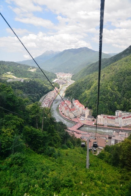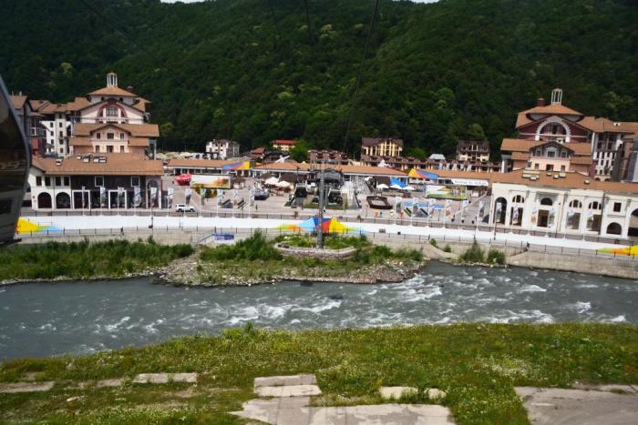 Мы воспользовались лишь одной опцией, предложенной туристам на летний период: купили билет на обзорный тур «Панорама Красной Поляны». Кабина подъемника, слабо подрагивая возле линий опор, уже возносит тебя ввысь, открывается обзор на центр «Галактика» и реку Лаура, давшую название лыжно-биатлонному комплексу, куда нам еще предстоит добраться.