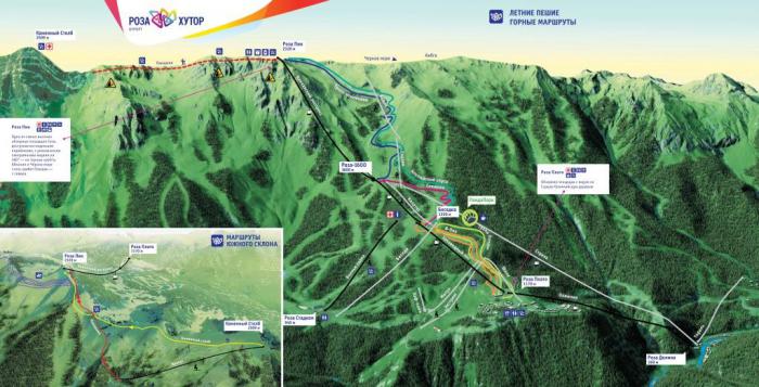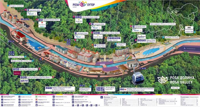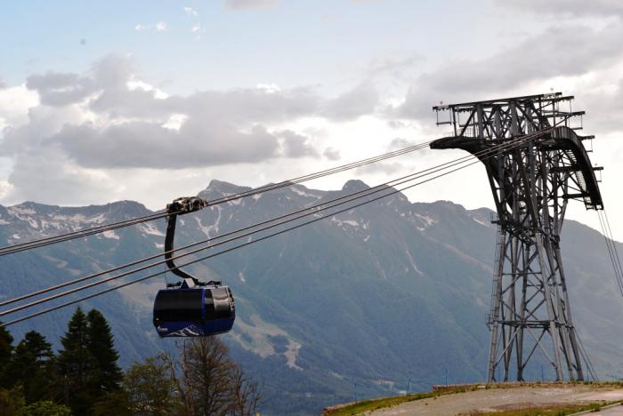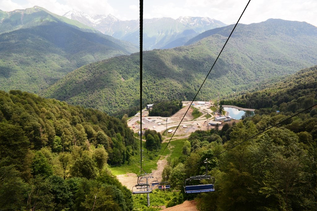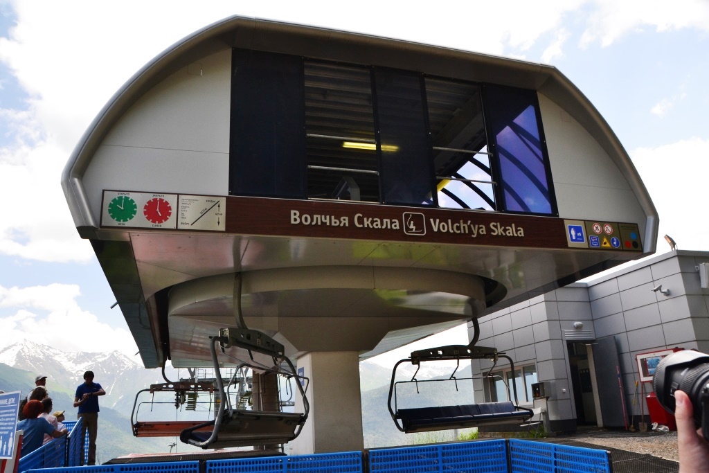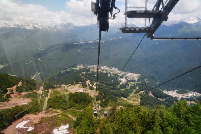 От станции Олимпия, расположенной на высоте 560 метров вРоза Долина (напротив Ратуши Роза Хутор на другом берегу реки), вверх отправляются подъемники. С каждым метром вверх открывается все больший обзор на курорты Красной Поляны: Роза Хутор остается внизу, справа – культурно-этнографический комплекс «Моя Россия», слева – Горки-город.