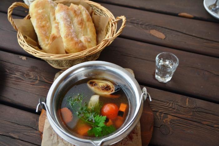 Взяли ухи из форели с овощами, обугленными на открытом огне, и кучу мелкой, зажаренной до хруста черноморской рыбешки. Подача была чумовой, на деревянных чурбачках, все запредельно здорово, но вот счет здесь оказался самым высоким за все время нашей поездки – 2400 рублей. Хотя, я думаю, ради такого натюрморта можно было пойти на траты!