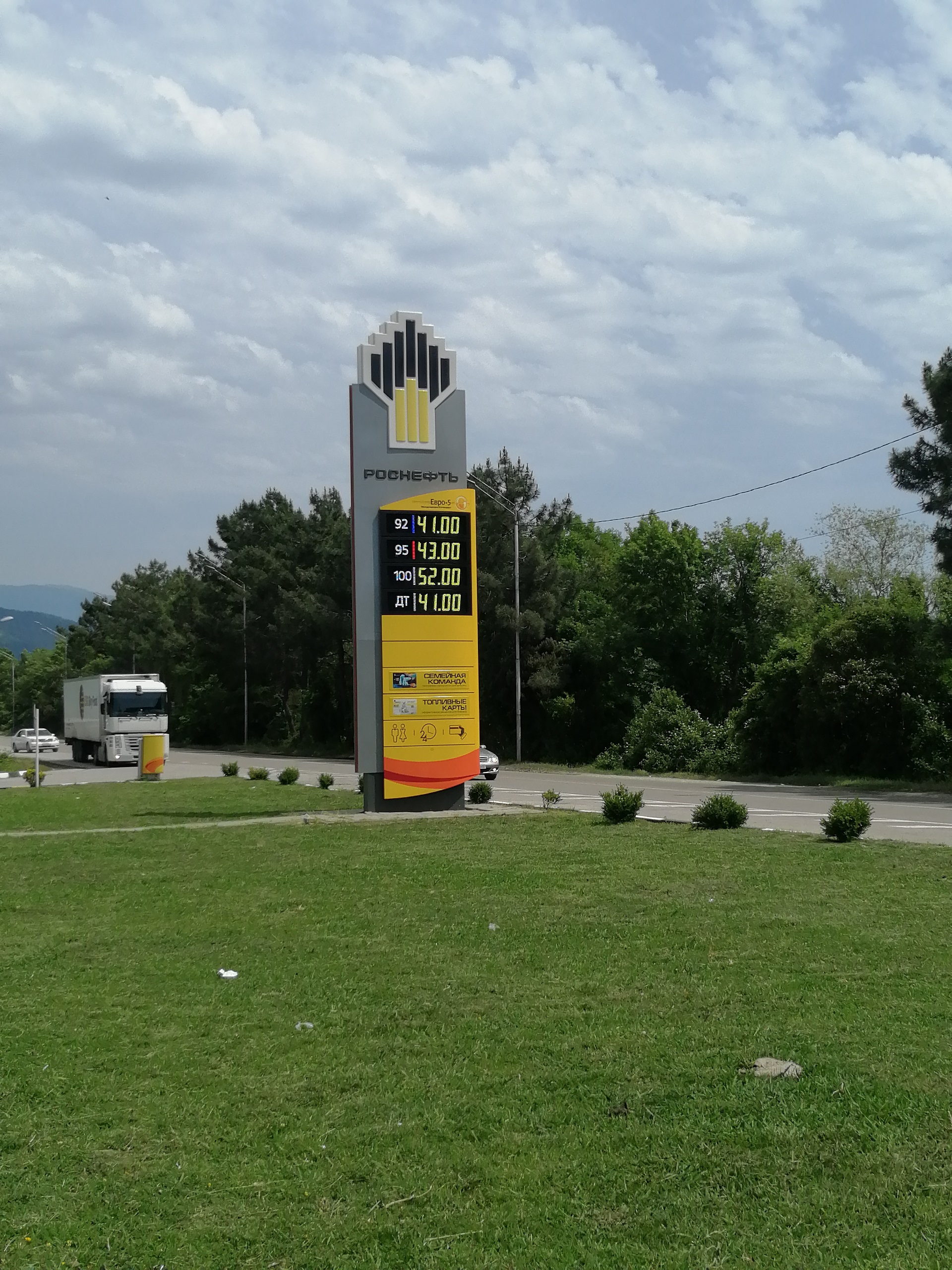 Сразу после границы по левой стороне стоит заправка Роснефть. Стоимость 95-го бензина 43 рубля, мы конечно же не упустили возможность заправиться. Расплачиваться можно картами.