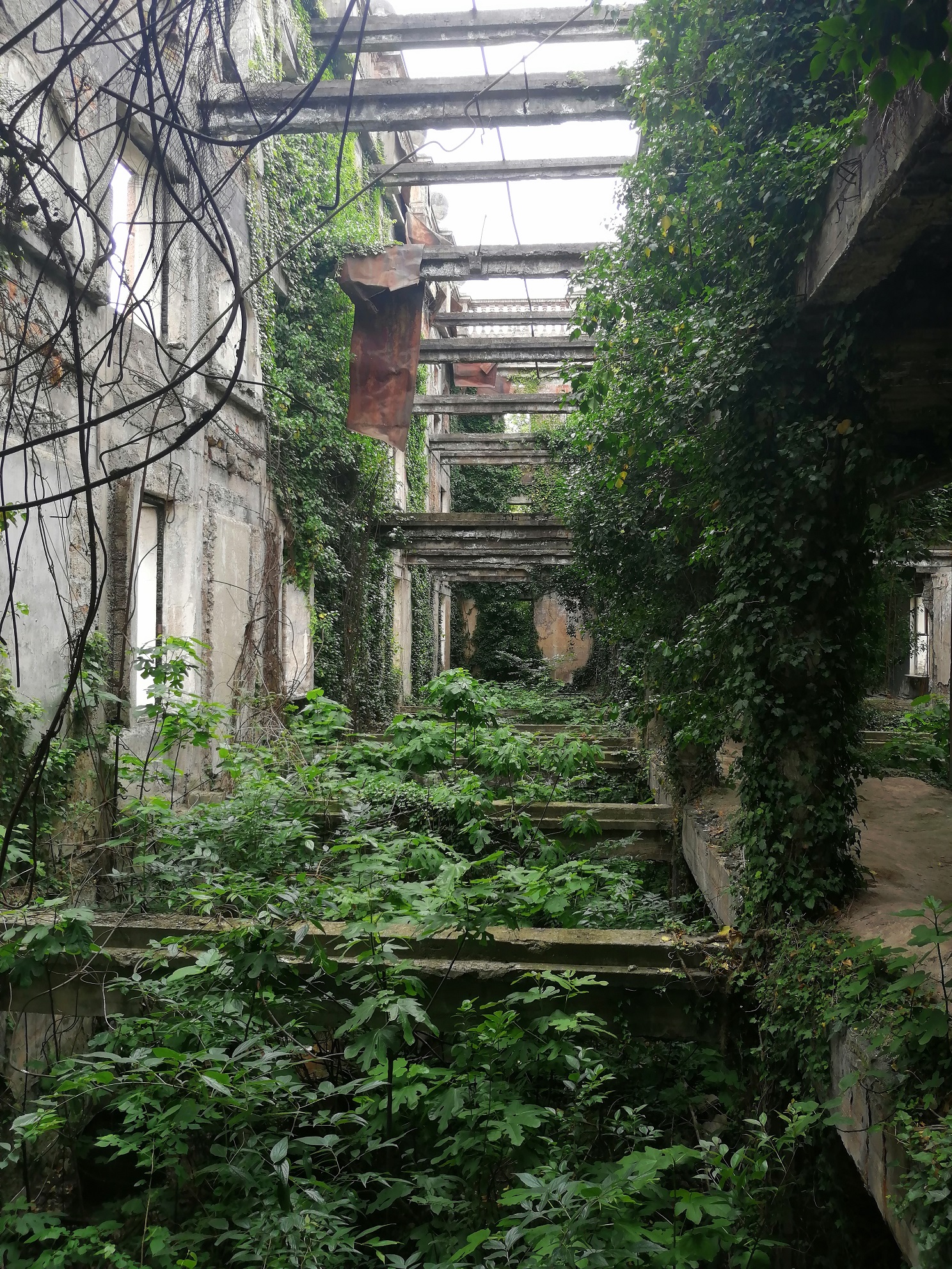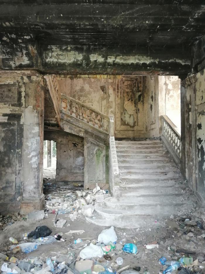 Внутри здания все разрушено. В некоторых помещениях заросли лиан