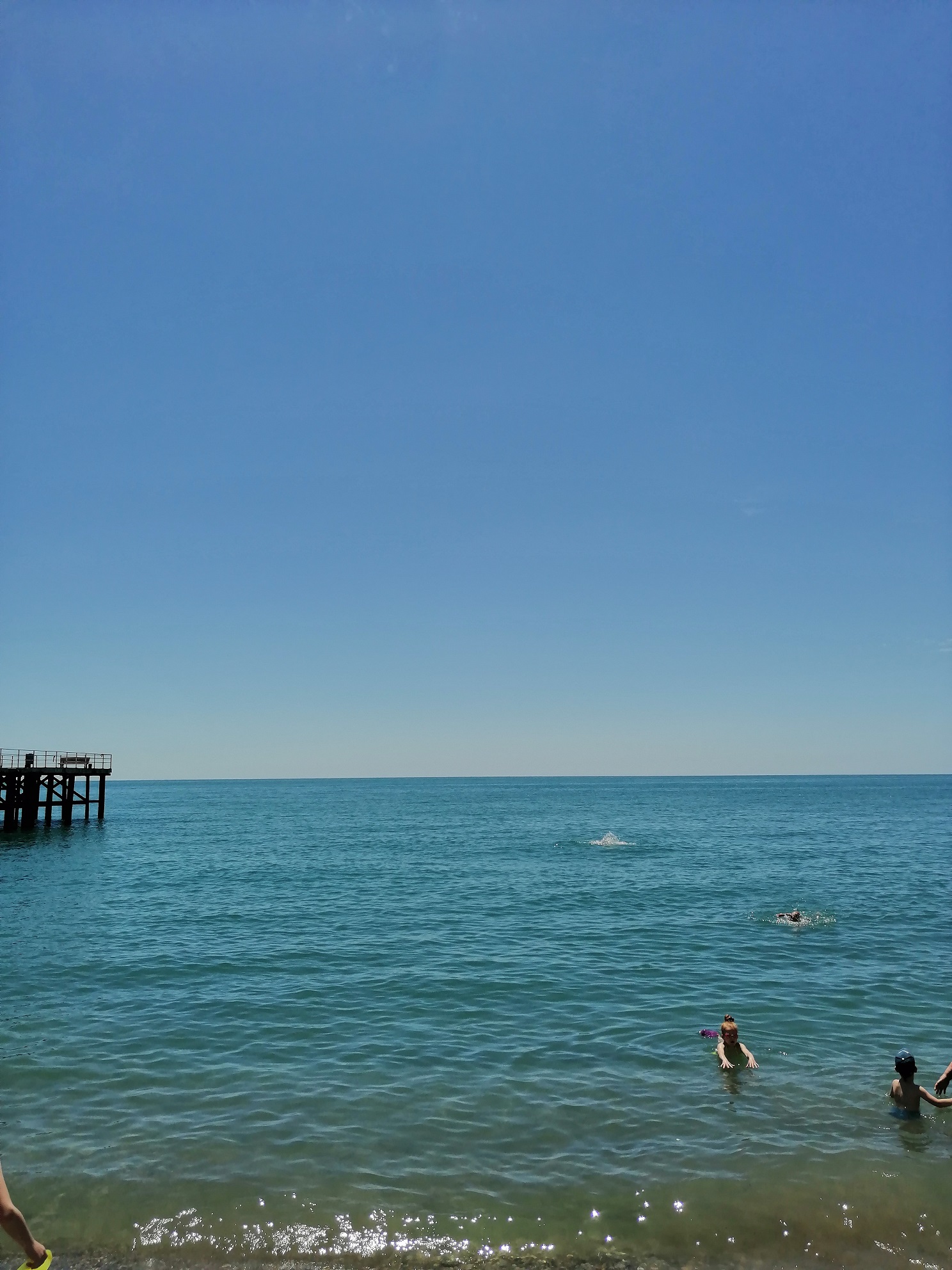 Дальнейший наш отдых состоял из лежания на пляже и купаний в море. Т.к. это было начало июня, вода была еще прохладная (примерно +19), но это нам не помешало поплескаться. Люди на пляже есть, но их значительно меньше чем на пляжах краснодарского края. Понятно, что еще не пик сезона и людей будет больше