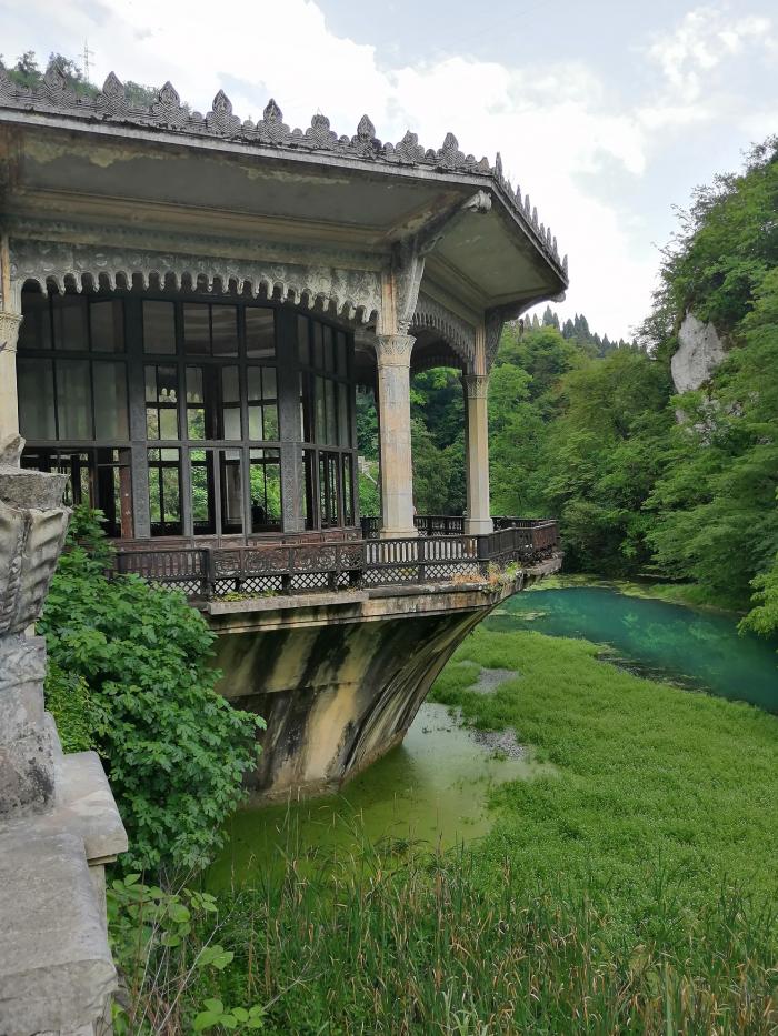 Справа от водопада есть лестница, по которой можно подняться наверх и выйти к очень красивой, но не действующей железнодорожной станции Псырцха
