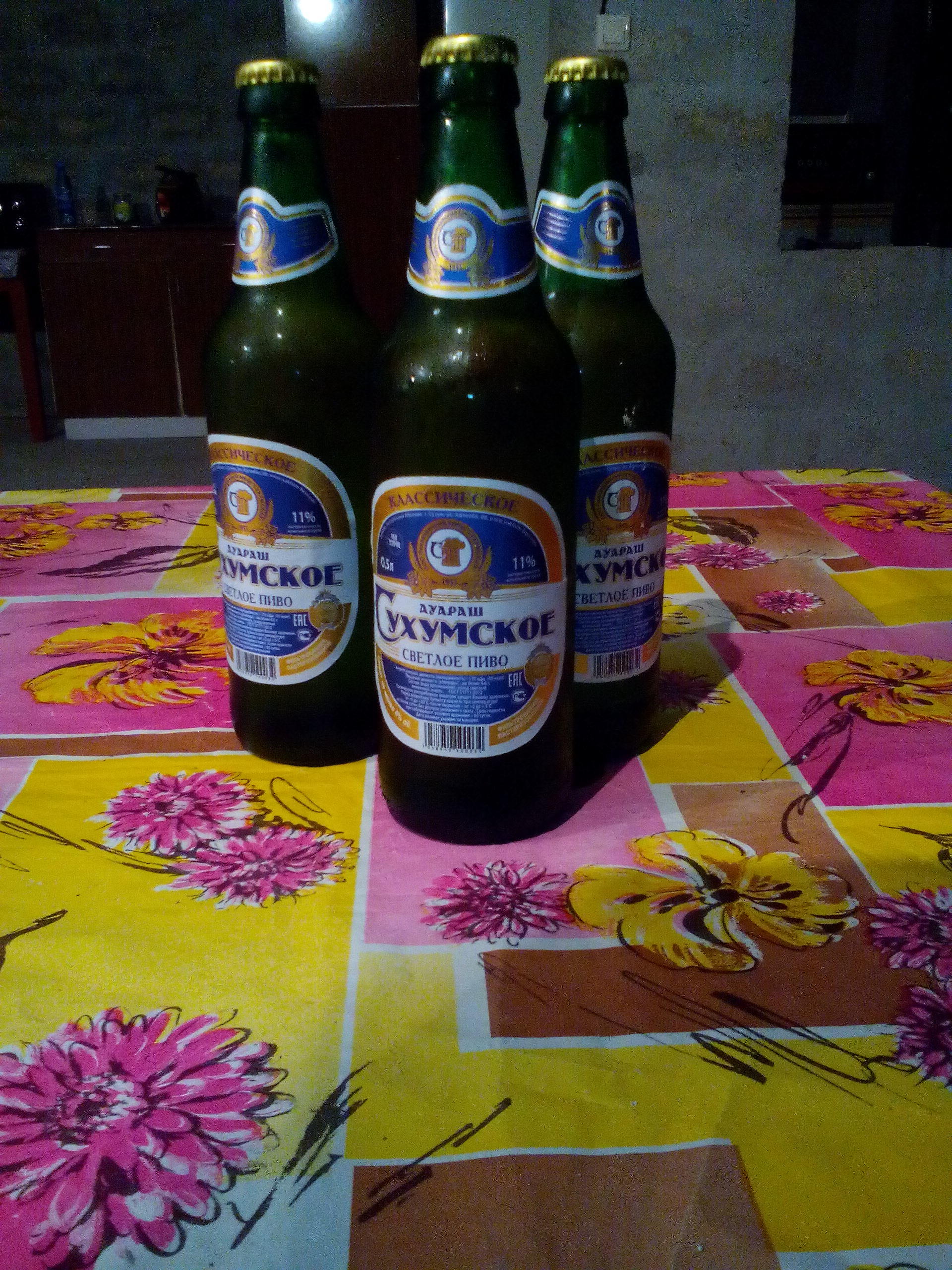 Сьездил в магазин. Купил четыре бутылки Сухумского пива и две бутылки вина.