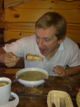 В Польше нет проблем перекуса и отдыха — харчевенки, кафешки и гостиницы вдоль всей дороги с очень маленьким интервалом. В одну мы зарулили. Кто будет в Польше — берите одну порцию на двоих, все очень вкусно и очень много. Персонал очень приветливый и дружелюбный. Мы были довольны — смотрите сами: