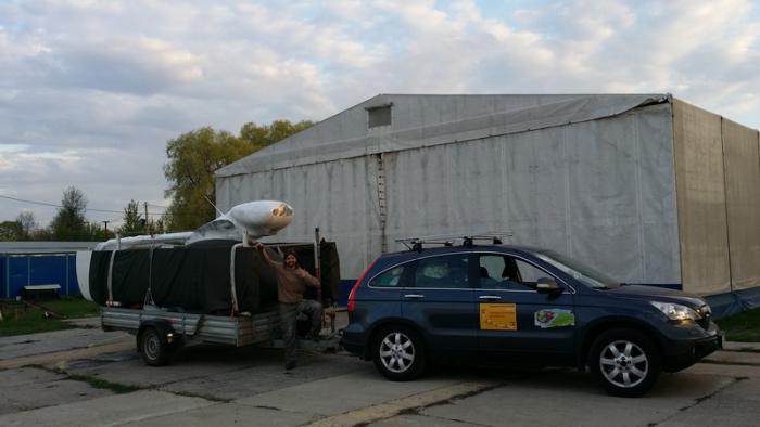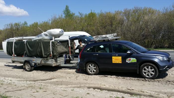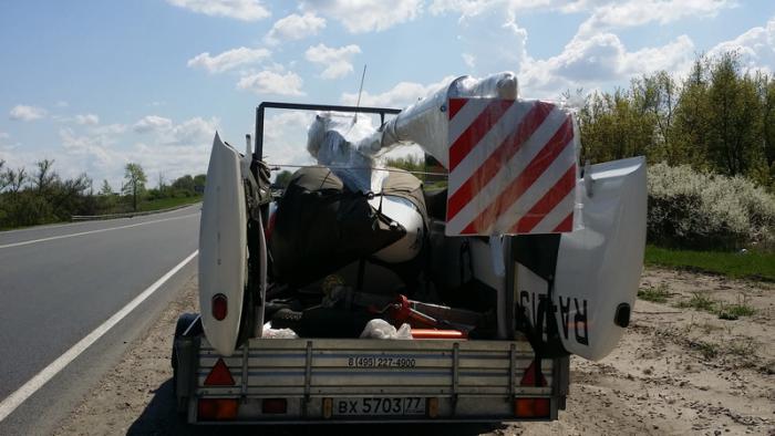 и прицеп для её перевозки. По пути захватили из Мытищ Таниного брата Лёшу, который самоотверженно помогал мне на всём этапе подготовки самолёта к транспортировки на прицепе. А это тааакой геморр, скажу я вам; разобрать, упаковать, поставить на прицеп, закрепить. Если даже вы верите мне, что это — очень сложно, то всё-равно это намного сложнее даже, чем вы могли бы себе представить. Огромное спасибо Лёше. Даже и не представляю, чего бы без него и делал!