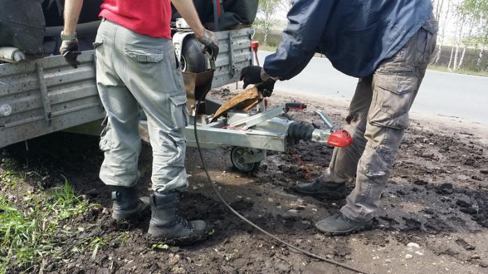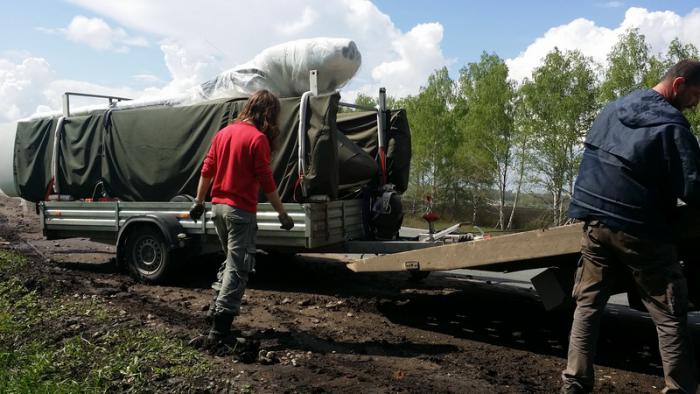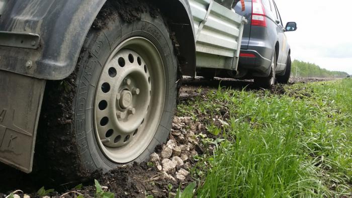 …А вчера полдня и всю ночь шли дожди… А я – лох, ибо не предусмотрел, точнее, не подумал о том, что обочина-то – размякшая. Потащило, в общем, чуть вниз по не очень крутому (слава Богу!) склону на грязюку автоаэропоезд. Не кувыркнулся прицеп – это просто подарок дня! Но застрял под углом где-то 10-15˚ с тенденцией правого колеса прицепа к скатыванию поперечно вниз. С Таней понакладывали под колёса как прицепа, так и автомобиля гальку, досочки и вообще все, что под руку подвернулось, но машине с передним приводом и гружёной сильно-много сзади никак не хватает сил продёрнуть прицеп хоть на сколько-нибудь вперёд. Более того, сама Хонда начинает чуть скатываться по грязюке всё ниже по склону. Стрёмно…
