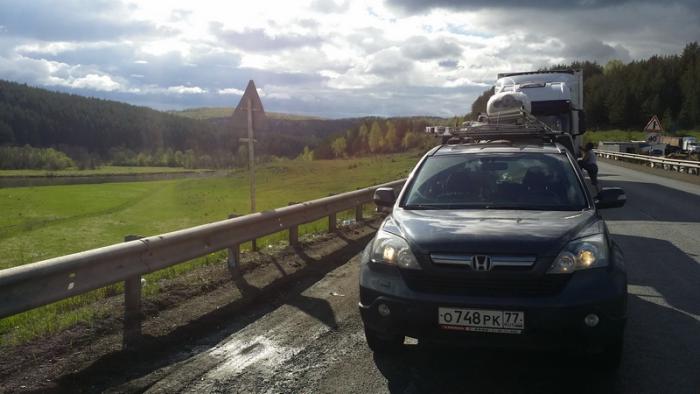 В 7:30, получив благословение вновь приехавшей (теперь уже чтобы принять номер) Натальи, выехали в сторону Уфы. Местами в Самарской области дороги были тааакие, что феншуй не велел мне разгоняться и быстрее 30-40 км/ч. Ну ничего, плелись себе и плелись, но после очередного трэш-участка я решил сделать плановую (а они у нас каждые полчаса-час) остановку на обочине с целью осмотра креплений самолёта.