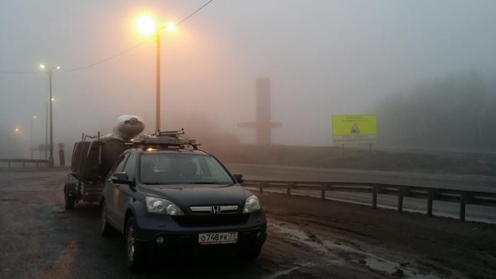 Едем дальше. Вверх-вниз, вверх-вниз. Местами качество хороших горных дорог вдруг резко портилось, тормозили и плелись 20-30 км/час. Вроде бы и оставалось уже немного, километров 160 до цели, но таяли они крайне медленно. Начинало темнеть, накрапывал дождичек. Концентрация невероятная, ибо узко, сколько, извилисто, прицепно-самолётно. В Златоустовский округ, начало которого судя по столбу, нами встреченному, находится достаточно высоко, мы въехали, попав в натуральное облако. Видимость — 40 метров. Противотуманки — ВКЛ, сверхвнимание и бдительность — ВКЛ.
