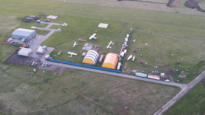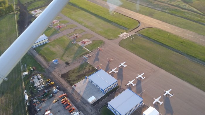 Вот уж действительно, образцово-показательный : две перекрещивающиеся взлётки на случай любого ветра, гостиница с видом на них, отдельно стоящая гостиница, бильярд и даже пожарная техника имеется. Ну а тамошний инструктор Сергей провел мне экскурсию по ангарам. Я просто обалдел, всё как в кино по части аккуратности! Ангары капитальные — металлические, очень просторные, все чистенько, аж блестит.