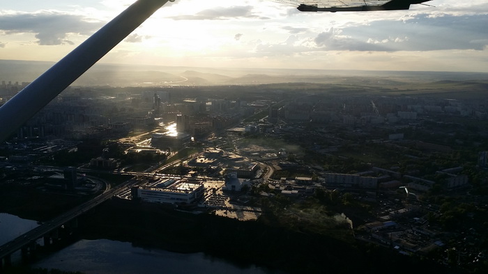 Нас встречает Влад, его спутница Мила и курсант/авиатехник Андрей. Рассказываем им про свои приключения минувших суток. Андрей, по счастливому стечению обстоятельств, специалист по охранным системам, в частности иммобилайзерам. Слово за слово, как уже увесистые пучки проводов торчат из-под обшивки автомобиля – Андрей взялся исключить иммобилайзер из электрической сети авто к чертям собачьим. Не успел я осознать столь благоприятное стечение обстоятельств, как Влад уже приглашает нас с Таней совершить аэропрогулку над Красноярском! А погода – просто идиллия: тепло, небо едва подернуто легкими облачками, а солнце еще достаточно высоко над горизонтом, хотя дело и близится к закату.
