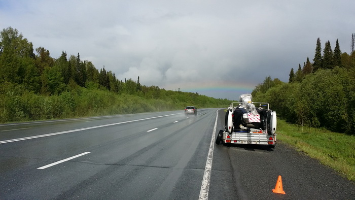 Договорились о месте встречи перед городом. После очередного piss-стопа возле неприметной придорожной кафешке уже в Кемеровской области машина отказалась заводиться. Стартер крутит, топлива полно, зажигания нет. У нас такая петрушка уже случалась под Омском, но тогда на –дцатой попытке машина внезапно завелась, и мы забыли об этом инциденте. Тогда подумали на плохой газ, коим недавно заправились. Сперва возникла мысль, что опять плохой газ, и что, вероятно, вода попала в цилиндры. Что, мол, постоит машина немножко, вода стечет куда-то там, и мотор снова заведется. Но внушительное количество попыток запуска успехом не увенчалось. Делать нечего, решили звонить в . Там нам любезно предложили два эвакуатора (один для авто, другой для прицепа) до Кемерово. Но мы взяли тайм-аут, поскольку мне в голову закралась мысль о возможных глюках нештатного иммобилайзера. Начал звонить в Москву, в компанию, которая мне его ставила и выяснять, каким образом возможно его отключить нафик физически. Подсказали, куда рыть, и – вау! – машина завелась. РАМКу с благодарностью дали отбой, а сами продолжили двигаться в сторону уже заждавшегося нас Вячеслава.
