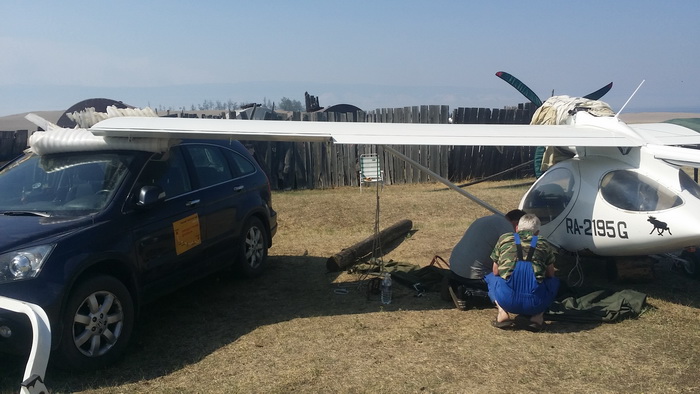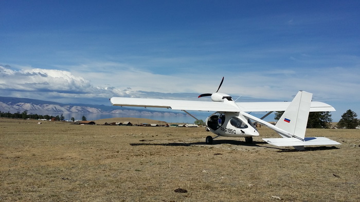 Итак, всё готово! 6-го числа встречаем из аэропорта Лёшу, брата Тани, который, кстати, привёз из Москвы щётки самолётного стартера. Последние 4-го июня сказали «Привет!» и двигатель перестал запускаться. Благодаря квалификации Оёковских техников-пилотов удалось вовремя выявить, что дело именно в щётках стартера, и мой отец успешно купил оные и передал Лёше. Стартер отремонтирован, пришла пора практиццки торжественного облёта Сигмы. Думал так: сперва с подскоком, попрыгаю несколько раз туда-сюда по полосе, зарулю на стоянку, где детально осмотрю борт на предмет выявления каких-либо огрехов сборки. Собирали-то с Таней вдвоём, техники лишь немного помогали руками и советами только лишь в определённых моментах. Стрёмно, ничего ли не отвалится?.. Выруливаю на взлётную полосу. Газ на полмощности, разбег, небольшой подскок. Толком и не пролетел нисколько. На противоположном конце полосы, разворачиваюсь… Небольшой боковой ветерок. Газ – взлётный режим. Разбег, самолёт вспухает и его немного сносит ветром на бакены. Чуть прибираю газья. Резко плюхаться с риском напороться на бакен? Снова газ во взлётный. Так называемый «упс» случился. Я лечу с набором к первому развороту. Спина можно сказать мокрая; а вдруг вот прямо сейчас, на высоте 70 метров чегой-то да отвалится. Но отступать нельзя – за нами Оёк. Да-да, забыл упомянуть, что у меня был перерыв аж в три месяца после крайнего полёта 23.02.2015. Но приобретённая за три года пилотирования выдержка сделала своё дело: я спокойно пролетел круг, зашёл на посадку и благополучно приземлился! Осмотр самолёта – всё хорошо. В этот же день я отвёз Таню с братом, а также Богдана (про него подробнее чуть позже) на Остров вместе с порожним прицепом с тем, чтобы на днях вернуться с тем самым Богданом на маршрутке в Оёк и пригнать самолёт на Ольхон.