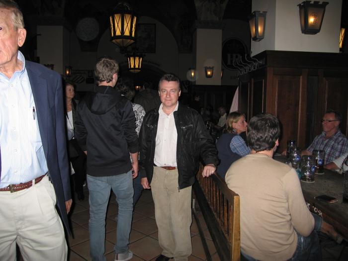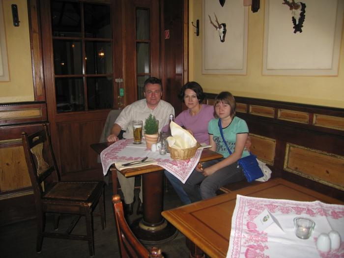 Увиденное очень удивило: был вечер рабочего дня, а зал в пивной был не просто полон, а набит битком. За столами сидели обычные немцы, туристы и бюргеры, одетые в национальные костюмы с охотничьими шапками. Везде между столами бегали официантки с кружками пива, и очень громко звучала немецкая музыка. Народ веселился и пел песни. Увы, места нам не нашлось, да и жене и дочке такая обстановка не очень понравилась. Пришлось просто купить сувениры – пивные кружки — и уйти поискать место для отдыха поспокойнее. И буквально напротив, в соседнем здании располагалась еще одна пивная, где было намного меньше любителей пива, но всё же почти все столики были заняты. Когда мы вошли в нерешительности, то к нам сразу обратились администраторы, и, узнав в нас русских, отвели в тихое место и принесли меню на русском языке. Это так подкупило и расположило нас, что мы решили остаться и основательно поужинать.