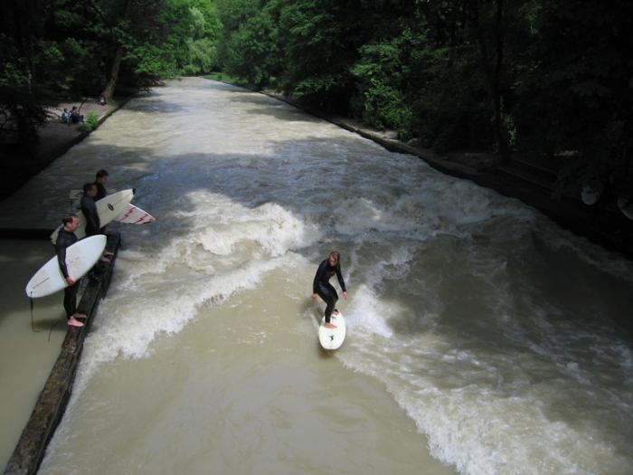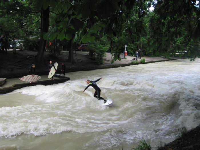 Представляете, в самом центре Мюнхена можно получить дозу адреналина, как на побережье океана, ну или что-то похожее. По Английскому парку протекает река, при выходе из-под Принцрегентштрассе она преодолевает пороги и ускоряется, образуется своеобразная волна, на которой и стараются удержаться виндсёрферы, очень завораживает.