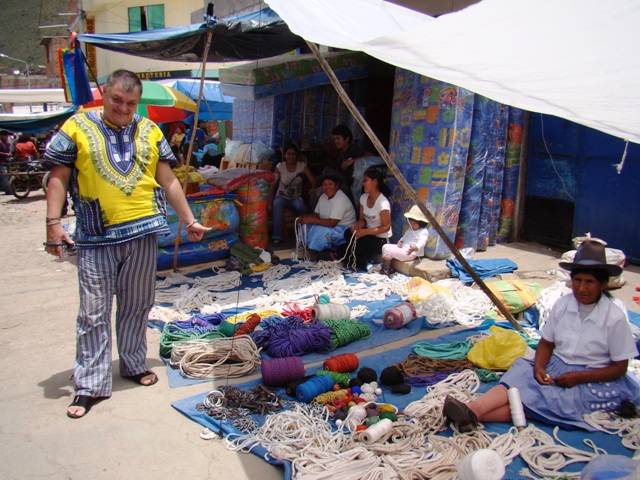Заезжаем на местный воскресный рынок в CARHUAZ. Плетут верёвки, продают шляпки и местную одежду.