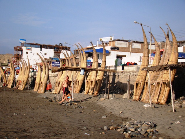 Здесь на пляже знаменитые рыбацкие лодки из тростника.