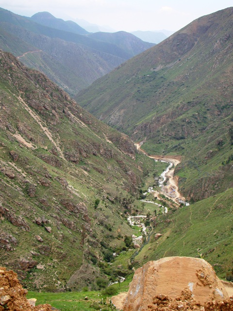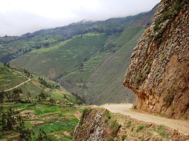 Перевал 4150 метров. Десятки грузовиков строят дорогу. Заехали в облака. Дорога приятнее, чем вчера. Периодически попадаются указатели на нашу цель – городок CASMA. По километровым столбам до него 138 км. На GPS эта дорога у меня показана. По прямой как и вчера – 85 км напрямую. Едем, потихоньку спускаясь в долину. Снежных вершин нет, но виды всё равно – великолепные. Домики. Деревеньки. Поля. Речки. Ущелья. На горах сложные зигзаги дорог. В очередной деревеньке дорога перекрыта. Полицейский с пистолетом говорит, что идут взрывные работы и проезд откроется в 17-00. Нам ждать 3,5 часа. Влад с Валерией начинают вести переговоры. Доезжаем до начальника. Он фотографируется с нами и нашей машиной и разрешает ехать.