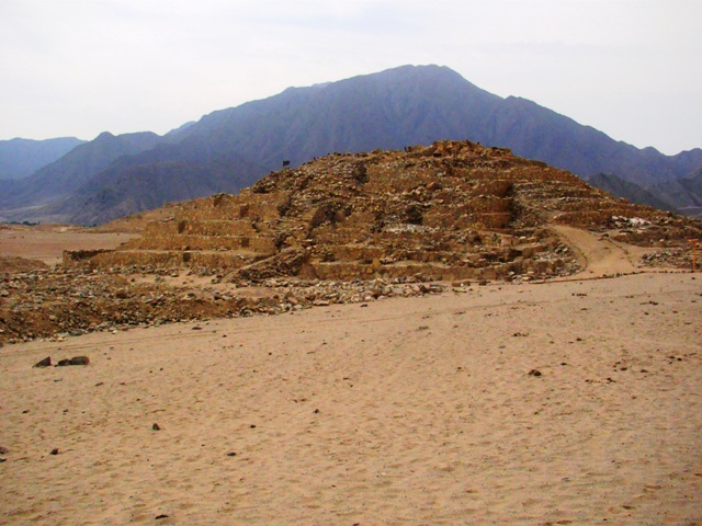 Пробка закончилась как только выехали из Лимы. Потом дорога по пустыне. Не очень симпатичная. Океан далеко слева. Горы далеко справа. Редкие грузовики и автобусы. Легковушек почти нет. Один раз тормознули менты и попросили презент из России. Документы даже не просили. Я дал им наклейку с картой маршрута по планете Земли, они расстроились, но карту начали изучать. Через 170 км от Лимы свёрток направо на Кораль. 25 км по асфальту, но потом 2 км идти пешком.
