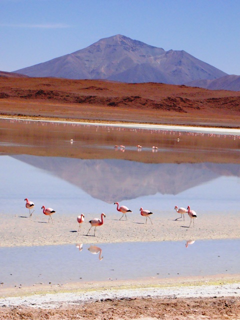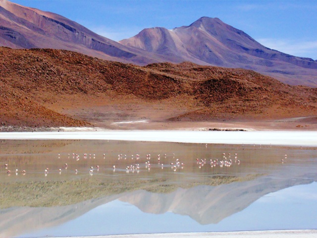 С птицами, фламинго, туристами. Горы и фламинго отражаются в воде.