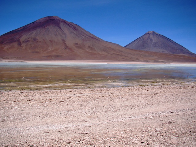 красная Лагуна Колорадо. Мы спускались к ней с горы. Дорога проходит вдали от озера, и мы свернули к озеру.