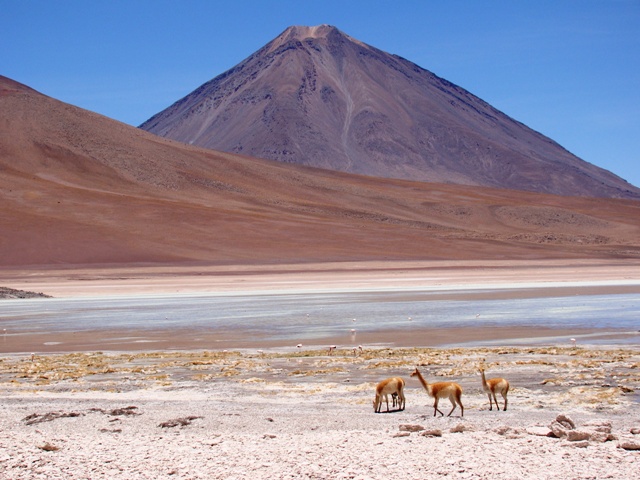 Подъезжаем к дамбе. (S19o46.820, W67o32.736). 20 метров прибрежной грязи засыпаны огромными булыжниками. Все дорожки ведут к скале на берегу. Красота. Источник кристальной воды из скалы. Речка. Ламы пасутся. Рай…