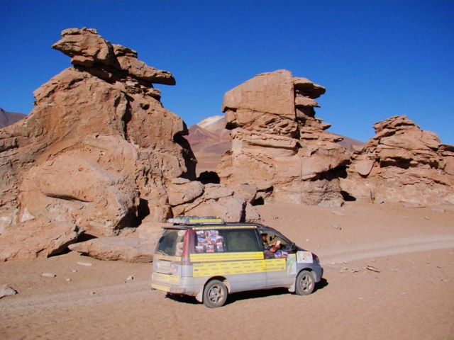 Объехали. Выехали к базовому лагерю около Лагуны Колорадо. По Боливии проехали 125 км. С десяток сильно потрёпанных джипов. В них по 6 пассажиров. Окна открыты. Все в пыли. Всех селят в 6 – 8 местные комнатки. Народ сидит в «холле» — пьёт воду из бутылок. Короче, праздник у европейцев — в самом разгаре. Я расспрашиваю местного водителя — где здесь каменное дерево. Улыбаются – говорят – на твоей машине 1 час на север. Это около 20 км. Но это они меня не знают. Через несколько минут опять ловлю этого боливийца. Начинаю расспрашивать по карте, где есть отель. Он объясняет. Потом я уточняю – значит 1 час на север до дерева, потом час назад и потом час на восток до городка с отелем? Он выслушивает и говорит. А на фига туда ехать? Вон в соседнем доме отель. Ловлю бабушку боливийку в шляпе. Она заводит в соседний дом (их всего 2 или 3). Там уже стоят пара джипов. 5 комнат и туалет с запахом туалета. Показывает на комнату с 6 кроватями вдали от туалета. Берёт с нас 100 Боливаров. Ура.